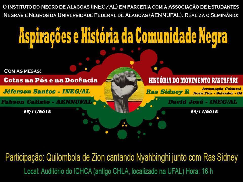 O Instituto do Negro de Alagoas (INEG/AL) em parceria com a Associação de Estudantes Negros e Negras da Universidade Federal de Alagoas (AENNUFAL) realizam o Seminário: Aspirações e História da Comunidade Negra