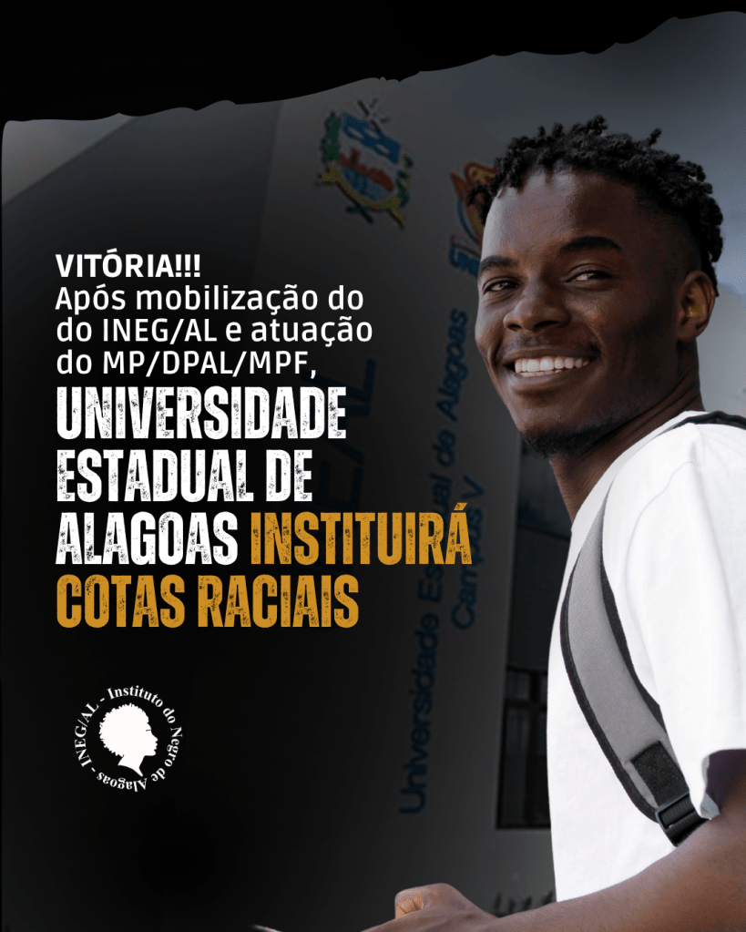 Após mobilização do Instituto do Negro de Alagoas e de outras organizações negras, a Pró-Reitoria de Graduação da UNEAL encaminhará proposta de reserva de vagas (cotas raciais) para negros, indígenas e quilombolas para ser aprovada no conselho superior da instituição. A atuação da Promotoria de Direitos Humanos do Ministério Público Estadual, sob responsabilidade da Promotora Alexandra Beurlen, foi de fundamental importância, a qual se deu por meio da expedição de Recomendação conjunta (MPE, DPAL E MPF) ao Governo do Estado. A Recomendação gerou a manifestação da Procuradoria Geral do Estado, a qual se referiu à questão nos seguintes termos: “[…] realça o dever institucional do Estado de Alagoas de promover a igualdade material e de combater as desigualdades raciais estruturais que historicamente alijaram determinados grupos do acesso pleno à direitos fundamentais – em especial a educação superior”. A Pró-Reitoria de Graduação da UNEAL, por sua vez, emitiu documento no qual “[…] se compromete a provocar as instâncias internas para regulamentar a implantação das cotas através de Resolução […] A Resolução será submetida ao Conselho Superior Universitário […] visando sua implementação […] no menor tempo possível.”
